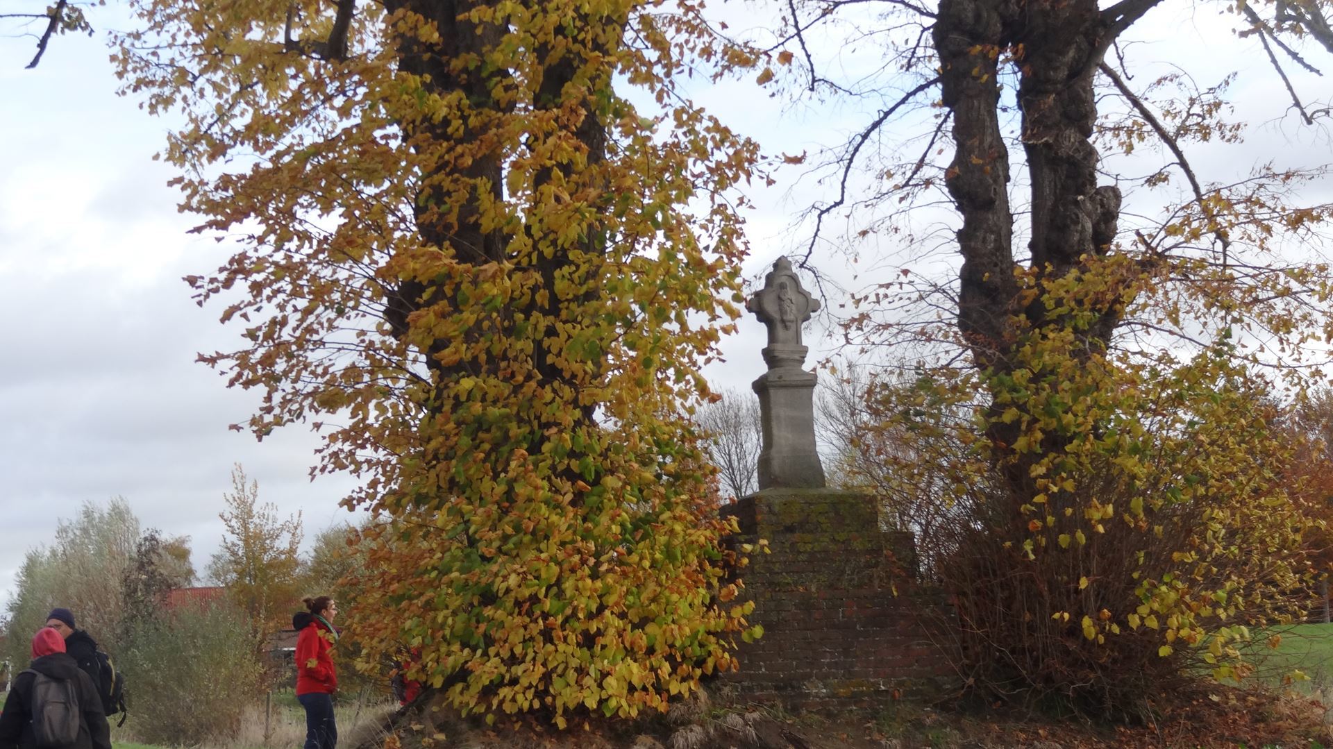 Posé sur un socle de brique, le calvaire se compose en premier lieu d’un piédestal divisé en plinthe, dé et moulure de corniche. Ce piédestal supporte un fragment de base de colonne, surmonté de la partie supérieure d’un chapiteau dorique. Au-dessus se trouve une croix, peut-être raccourcie, avec à l’intersection des branches un motif à trois lobes, le quatrième étant le montant de la croix. A ce niveau, nous observons le Christ surmonté d’une banderole sur laquelle est inscrit IHS (Iesus Hominum Salvator). Les bords sont moulurés sobrement. Sur l’épaisseur sont sculptées des feuilles enroulées.