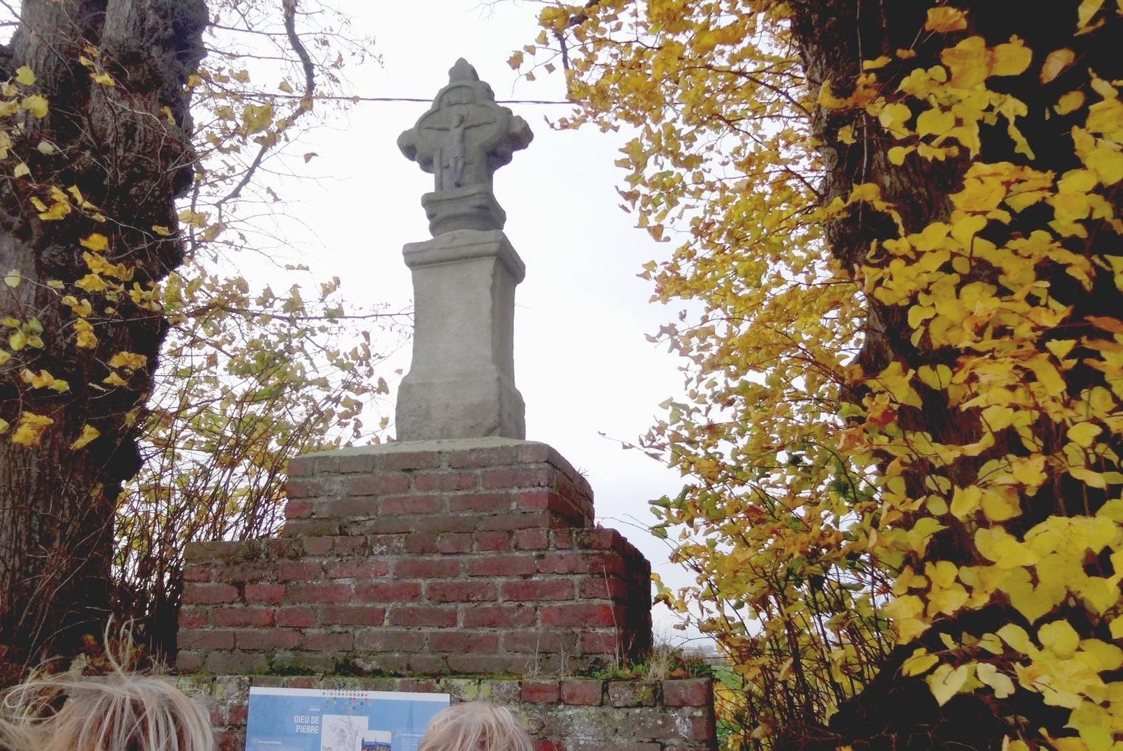 Ce calvaire se trouve à l’angle de la rue du Chapitre et de la rue du Bois. Deux tilleuls sont plantés de part et d’autre. Située entre la Cense du Chapitre et les traces de l’ancien château de Roupy, cette belle pièce sculptée pourrait provenir de ce château, visible sur les Albums de Croÿ et construit par les de Berghes, à l’extrême fin du XVIe siècle.